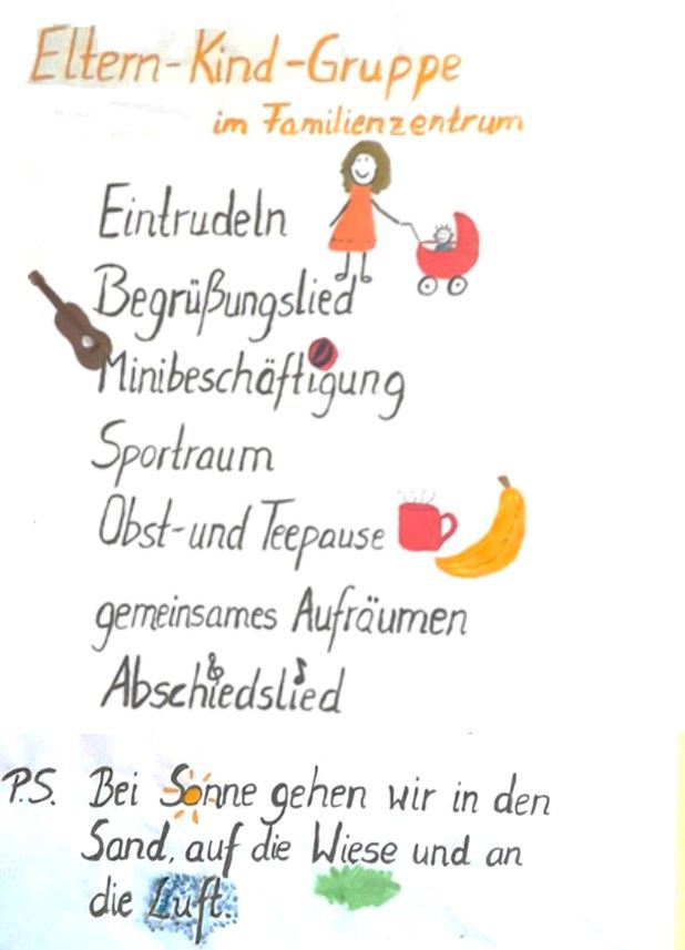 Singen, basteln, essen, spielen, trinken und dies in einer Gruppe. Kleinstkinder ab 8 Monaten erleben so erste Erfahrungen mit anderen Kindern, was sich positiv auf das Vertrauen zu Kindern und auf den späteren Alltag im Kindergarten oder bei einer Tagespflege vorbereit. Den Eltern wird hierbei die Gelegenheit geboten sich zu den Dingen des Alltags mit Kind auszutauschen. Dieser Kurs ist ein fortlaufender Kurs, ein Einstieg ist jederzeit möglich.